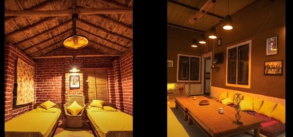 1. प्राकृतिक निर्माण शैली: यहाँ के कमरे पूरी तरह मिट्टी, गोबर और लकड़ी से बने हुए हैं। हर कमरे में देसी अंदाज को बनाए रखा गया है।